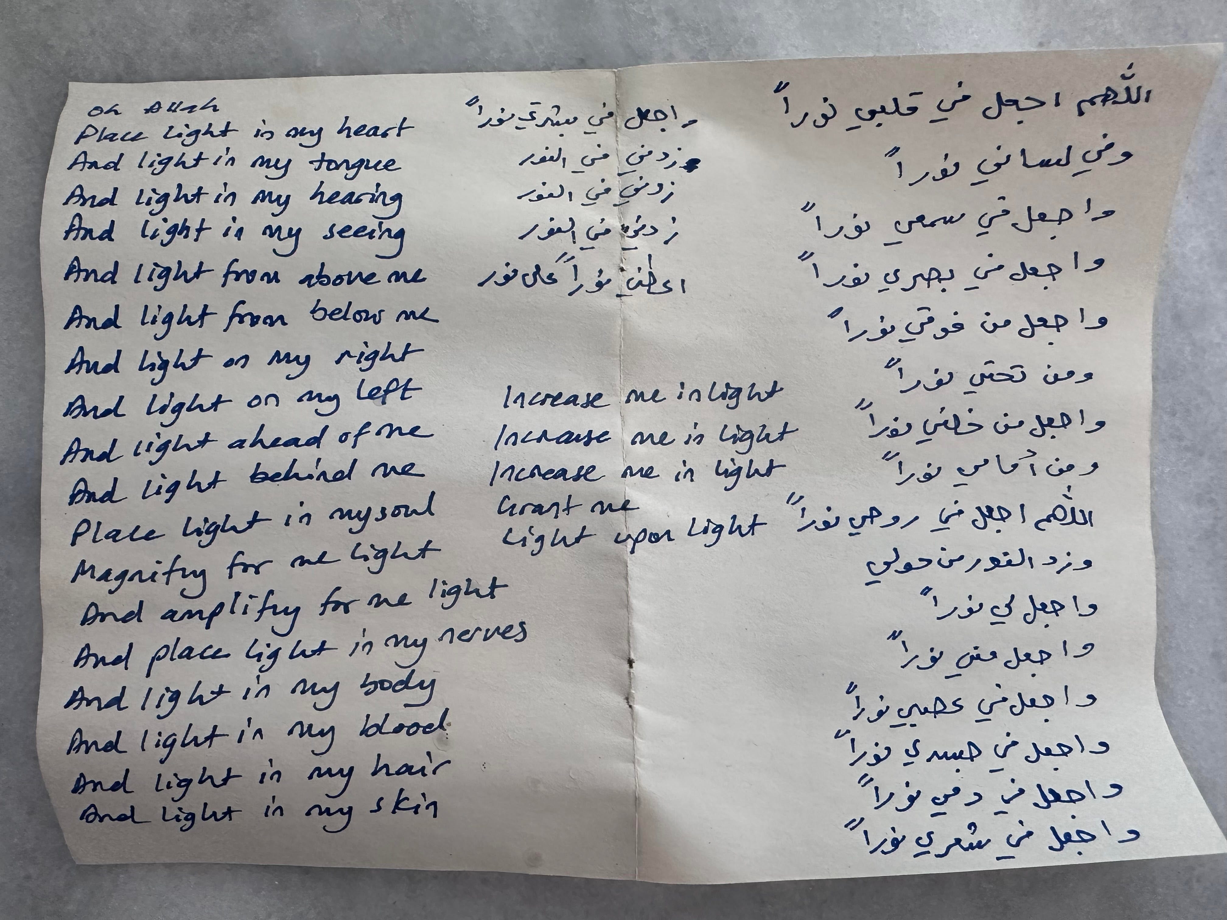 That evening at dinner, she told us what had happened, how the prayer had reawakened in her body. She later looked it up, it was called Du‘āʾ al-Nūr, The Prayer of Light, a prayer said by many before entering sacred spaces.